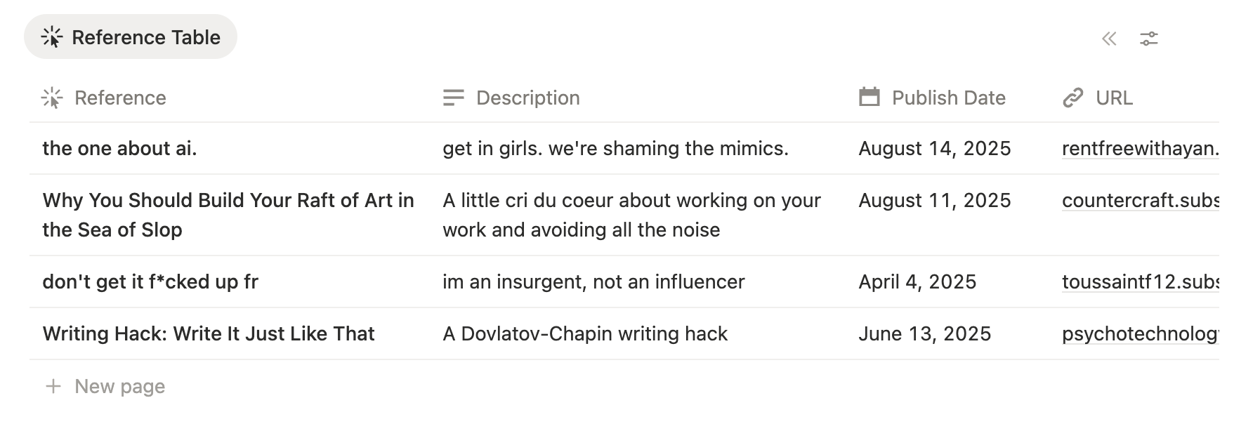 You can look at your physical library, your audible collection, YouTube history, Medium reading list, Substack stories — or maybe even just your preferred social media channels. Try to remember the references that have inspired you.